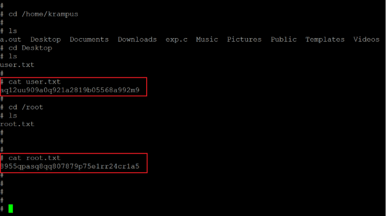 There were two flags. One was the user flag which was found in the user 'krampus' directory. The second and the main flag was 'root.txt' which was found in the root directory.