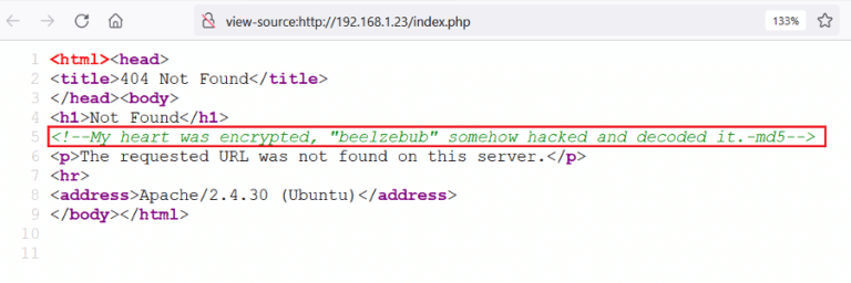 We started checking each identified file on the browser. We opened the 'index.html' file on the browser, which showed an error. When we checked the HTML source of the file, we found some interesting information which can be seen in the screenshot given below.