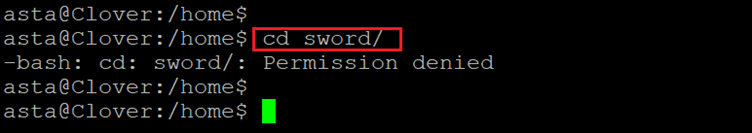First, we ran the cat/etc/issue command, and the output shows that Debian 8 is running on it. After that, we ran the uname -a command which shows the running version of the kernel. Since older Linux kernels have lots of privileges escalation vulnerability, we search online for a local exploit but didn’t get a working one. During the enumeration, we got another username, "sword," in the home directory. We tried to access that folder, but due to insufficient permission, we were not able to access it, which can be seen in the following screenshot.