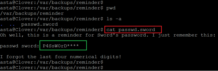 We got a file name password.sword in the reminder directory. We used the cat command to read the content which gives another tricky challenge in which some character of the password is given, and some characters need to be identified that we will do it in the next step.