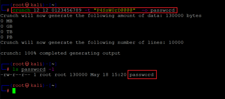 Crunch is a good tool to generate the wordlist, and the best part of this tool is that it defines the wordlist generation rules. In our current scenario, we know the eight characters of the passwords and the last four characters need to be identified; there are 12 total characters in the password. The below command is used to generate the password.