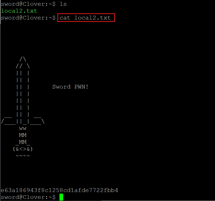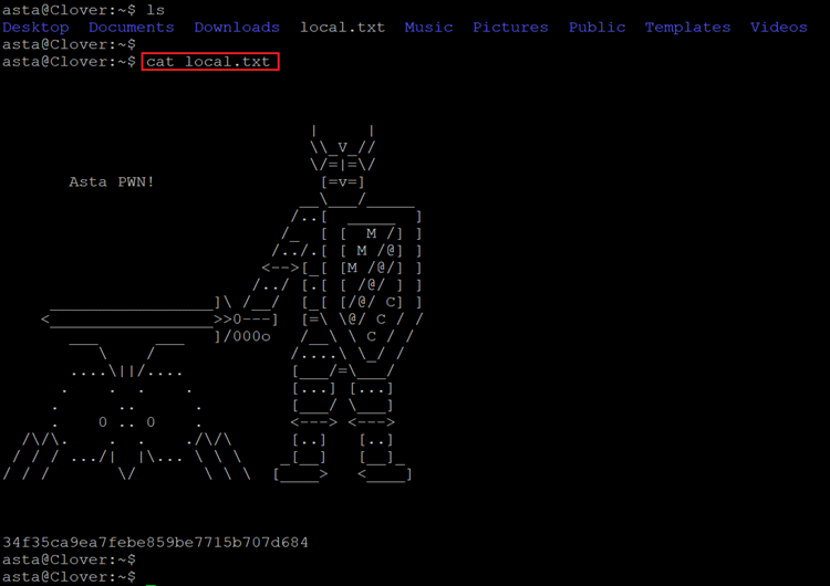 We used the cat command to read the local.txt file which shows nice graphics on the terminal with the MD5 value which is our first flag.