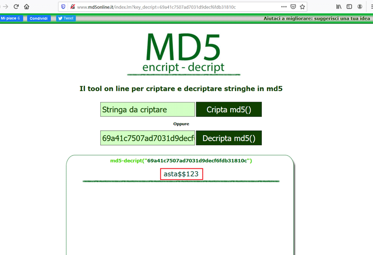 MD5 http://www.md5online.it/index.lm?key_decript=69a41c7507ad7031d9decf6fdb31810c