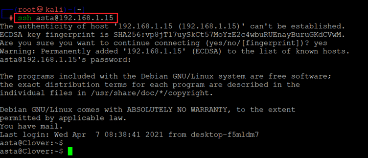 Command used: << ssh asta@192.168.1.15 >>