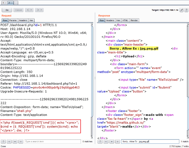 The above PHP shell will allow us to execute commands on the target machine through the browser. We saved the file as 'shell.php. Let's upload it on the target application; this can be seen below in the burp window.