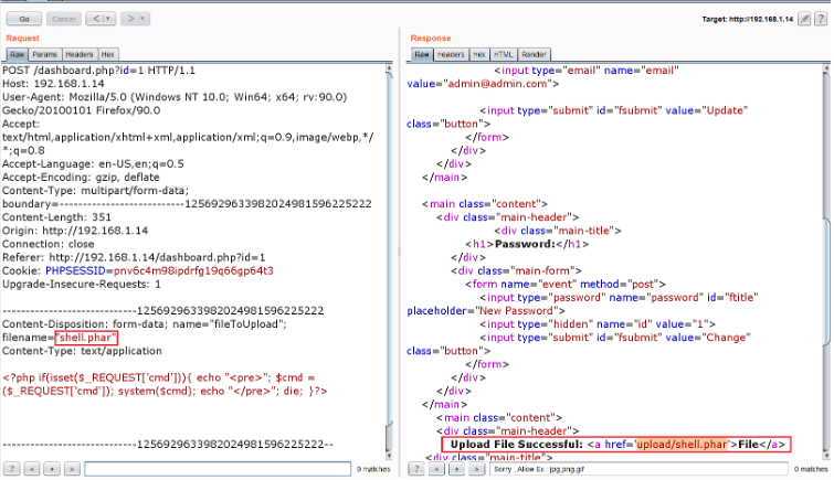 As can be seen above, the upload was unsuccessful, as the target application does not accept the 'PHP file extension. So, in the request section, we changed the file extension to 'phar.' This can be seen in the following screenshot.