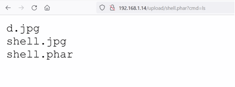 The file shell.phar can be seen in the above screenshot. We run the 'ls' command through the 'cmd' parameter to check whether we can execute commands on the target machine. The result on the screen shows that the command was successfully executed.
