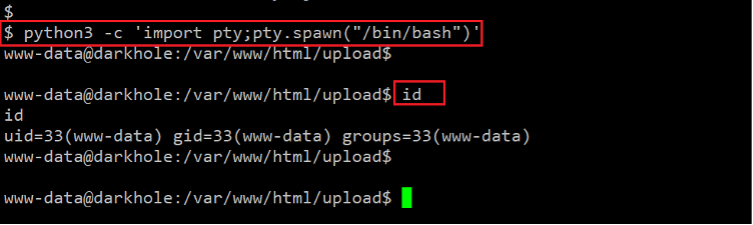 Command used: << python3 -c ‘import pty;pty.spawn(“/bin/bash”)’ >>