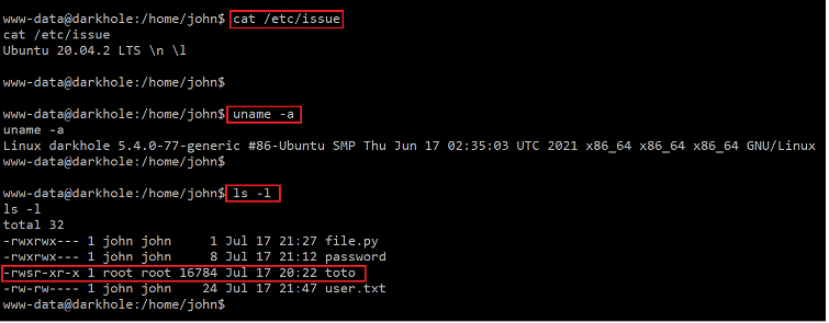 Let's try to gather information to get the root access of this system. We started with a few enumeration commands and checked each file and directory that we could access through this shell.