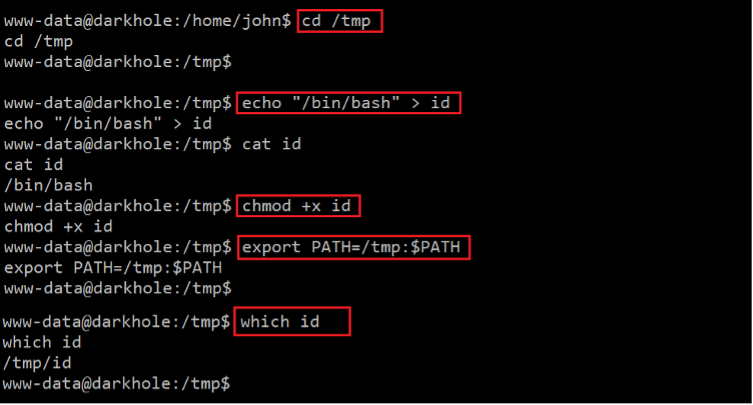 We had to do some research to identify a way to misuse the program's behavior. To do that, we first changed the current directory to '/tmp.' Then, we created a file named 'id' using the echo command. We added the '/bin/bash' script in the file and provided executable permission to the file by using the chmod command. Then we set the path to the tmp folder. We verified that the changes had been set by calling the 'id' path with the help of which command. The output shows the path set by us. This means the changes have been configured successfully.