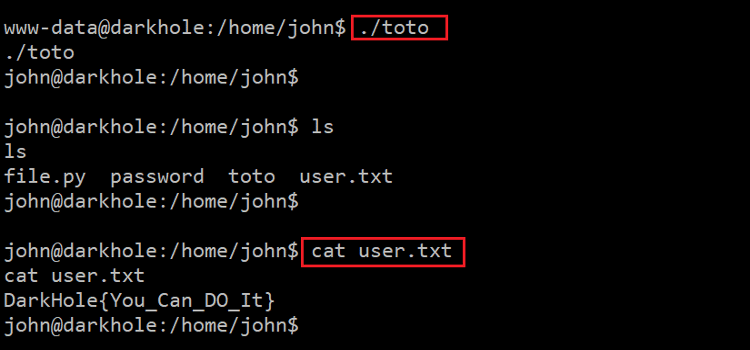 In the above screenshot, we see that we are now logged into the target machine as user' john.' We checked the contents of the current directory, where we found the first flag. The flag file named 'user.txt' can be seen in the above screenshot. There were also other exciting files which we will explore in the next step.