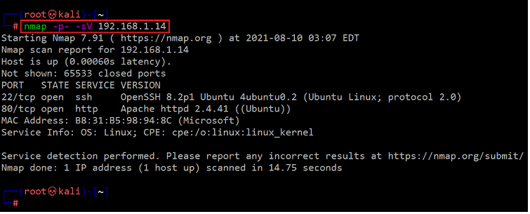 Command used: << nmap 192.168.1.14 -sV -p- >>