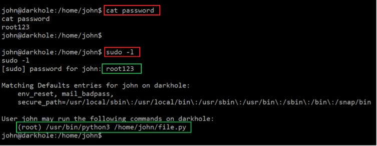 As we can see above, the password file contained a password' root123.' We also checked the sudo permissions by running the 'sudo –l' command and found that it needed a password to be executed. We provided the identified password, and it showed the output. We found a python file in the user directory that can be run as a root. We can edit this file to our advantage.