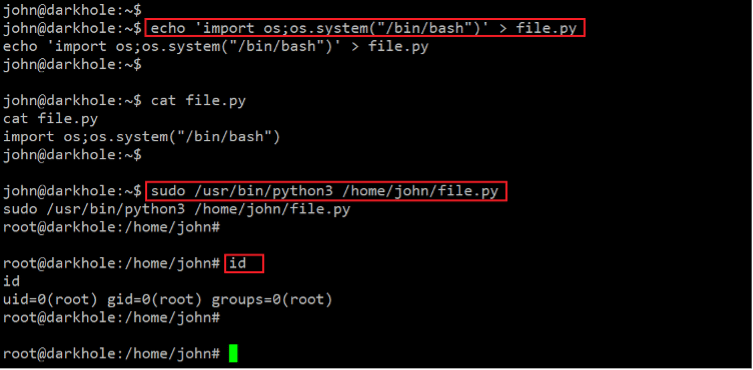 We used the 'echo' command to edit the 'file.py' shell in the above screenshot. We added the '/bin/bash/ script in the file contents. Then, we executed the file to get the root access of the target machine. This was verified by running the 'id' command, which confirms that we are now root on the target machine.