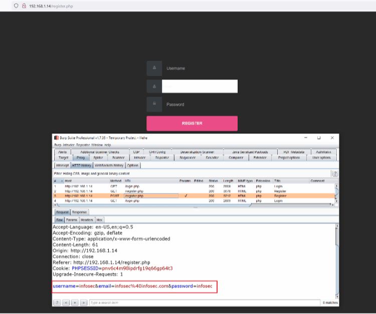 We registered as a new user on the target machine, and the request with the provided details can be seen above intercepted in the burp window. Let's use these details to log in to the target application.