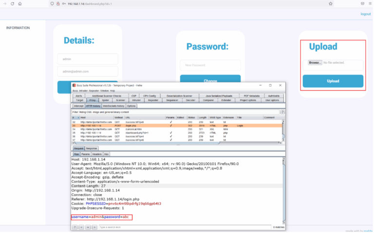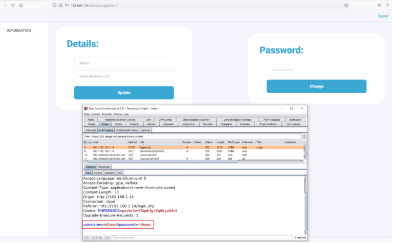 We logged into the target application with the username and password as 'infosec.' We analyzed the target application for vulnerabilities and found a few loopholes that can be used to our advantage.