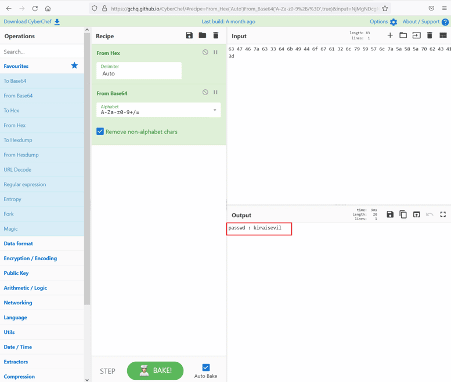 In the above screenshot, we can see that we used an online website, cyber chief, to decrypt the hex string using base64 encryption. This worked in our case, and the message is successfully decrypted. We got the below password —