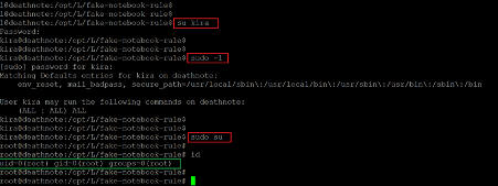 We used the su command to switch to 'kira' and provided the identified password. The password was correct, and we are logged in as user 'kira.' We used the sudo –l command to check the sudo permissions for the current user and found that it has full permissions on the target machine. This means that we do not need a password to root. So, we used to sudo su command to switch the current user as root.