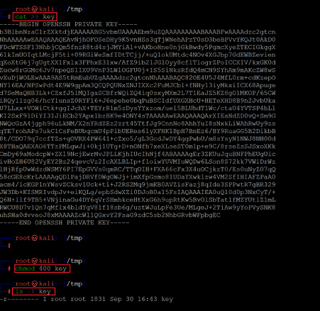 We have a user's private key, and from /etc/passwd file, we also know the username. So, let's try to log in with these credentials; however, before using the key, we have to change the key permission, which can be seen in the following screenshot.