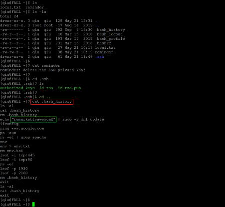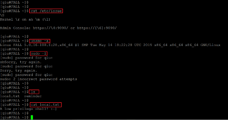 We searched over the web for an available local exploit for these versions, but none could be found working in our case. After that, we used the 'sudo –l' command to check the sudo permissions for the current user, but the sudo command was password-protected, and we do not know the password for the user qui. Next, we checked the contents of the current directory and found a clue hidden in a text file named 'local.txt.' The file mentioned a low privilege shell as some hint. So, we checked the bash history file for further clues, as seen below.