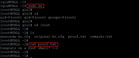We used the 'sudo –su' command to escalate user privilege. This changed the current user to root, which was confirmed by running the id command. The current user is now root. We looked for the root flag, and it was easily found in the root directory.