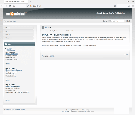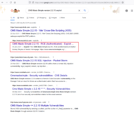 In the above screenshot, we can see that the website runs a CMS-based blog. We got the CMS name and version information from the website's footer. We searched the web for an available exploit and found a remote code execution vulnerability. The web results of the vulnerability can be seen in the screenshot given below.
