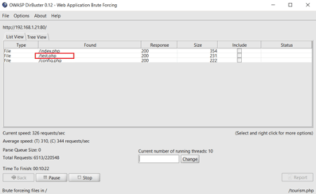 The Dirbuster scan identified a few files, which can be seen in the above screenshot. We checked each file and found an interesting file named 'test.php.' We opened the file into the browser, seen below.
