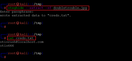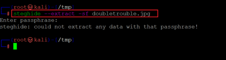 Command used: << steghide --extract -sf doubletrouble.jpg >>