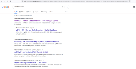 The target application can be seen in the above screenshot. The default page had a login form. However, the login page mentioned that the login form is for logging into ‘qdPM 9.1’. We tried a few commonly known credentials, but none of them worked. We also tried SQL injection to identify login credentials, but it was not vulnerable to SQL injection. We searched over the internet for some information about exploiting this software and found some interesting results, which can be seen below.
