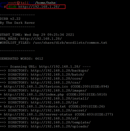 We started with a web application brute force scan to enumerate hidden directories and files. We used the Dirb tool for this purpose. The scan command and results can be seen below.