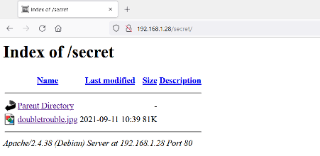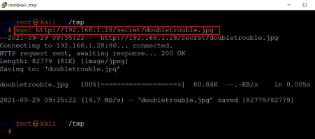 Command used: << wget http://192.168.1.28/secret/doubletrouble.jpg >>