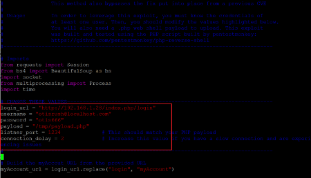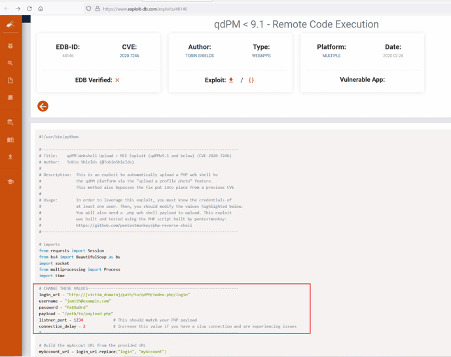 As per the information given on the exploit-DB website, we need to make some changes in the exploit to make it work. The highlighted area shows the variable where we have to make the changes before running it. The parameters are the login URL, login credentials, and the payload path, which will be uploaded to the target system. The usage section also mentions that PHP-reverse-shell exploit can be used here, which can be downloaded from GitHub. So, first, let us download the exploit on our attacker machine.
