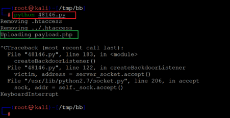 We ran the exploit, and it took some time, but after that, we got a message that the payload was being uploaded. But after that, we waited for a reverse connection, but we did not get any reverse connection. So, we forcefully exited the process and started analyzing the exploit program. By analyzing the details, we found the location of the uploaded file, which can be seen in the below screenshot.