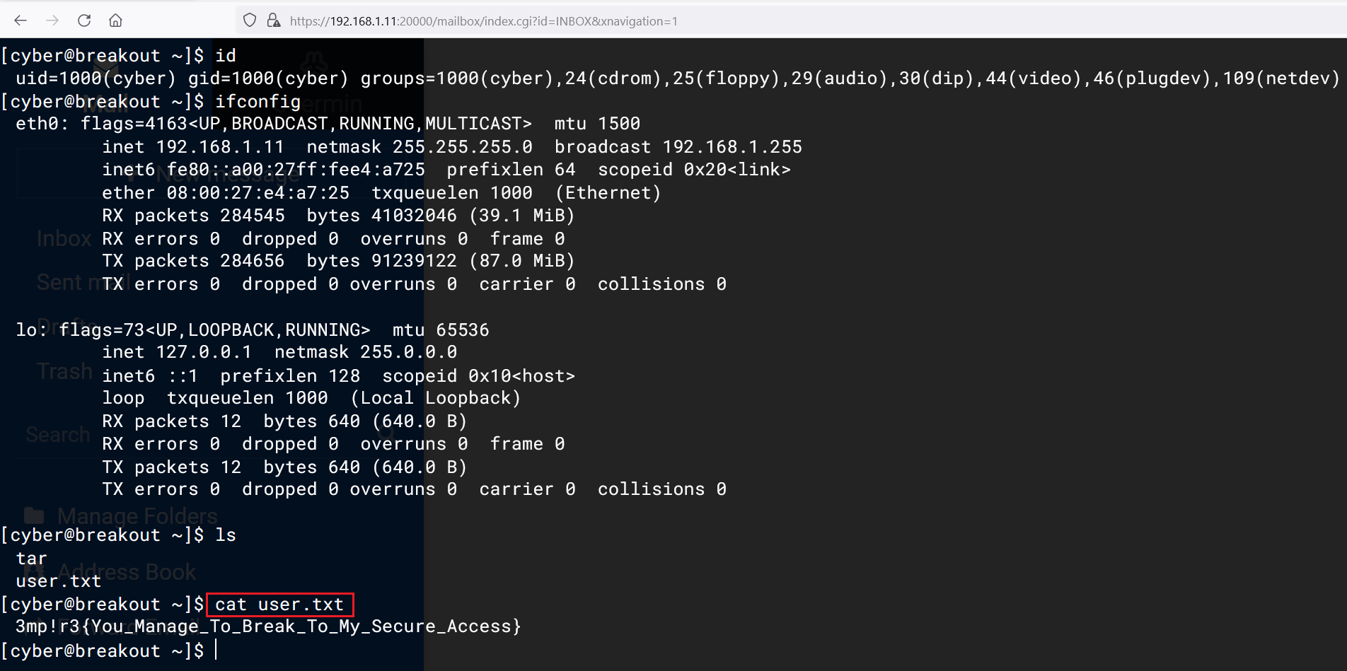 So now know the one username and password, and we can either try to login to the web portal or through the SSH port. At first, we tried our luck with the SSH Login, which could not work. Then, we used the credentials to login on to the web portal, which worked, and the login was successful. The 'Usermin' application admin dashboard can be seen in the below screenshot.