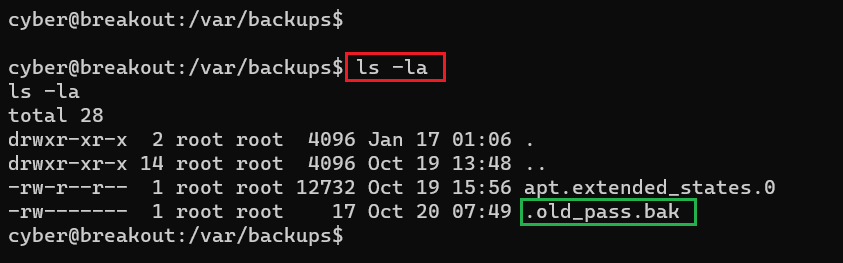 We read the' .old_pass.bak' file using the cat command. The password was stored in clear-text form. The identified password is given below for your reference.