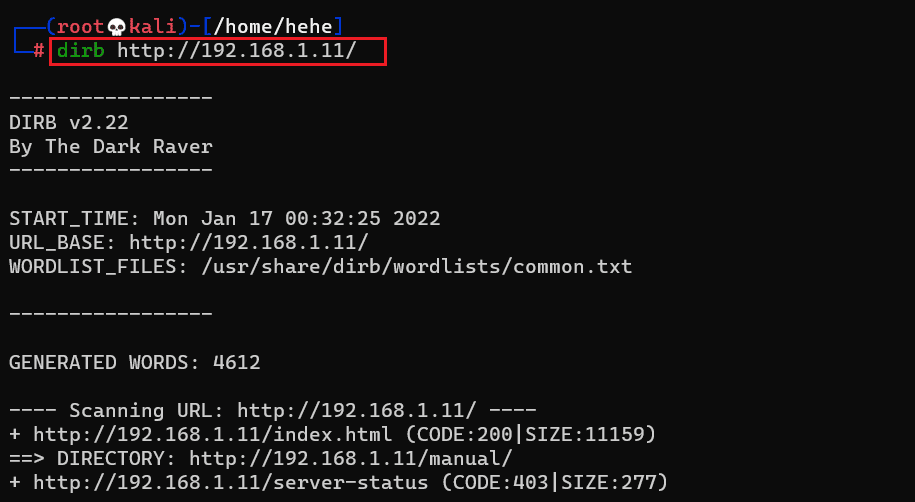 We can employ a web application enumeration tool that uses the default web application directory and file names to brute force against the target system. There are numerous tools available for web application enumeration. We will be using the 'Dirb' tool as it is installed in Kali Linux. The scan command and results can be seen in the following screenshot.
