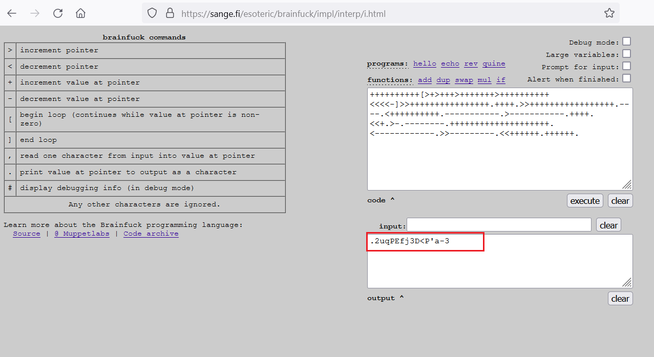 We analyzed the encoded string and did some research to find the encoding with the help of the characters used in the string. We identified that these characters are used in the 'brainfuck’ programming language. However, due to the complexity of the language and the use of only special characters, it can be used for encoding purposes. So, we did a quick search on Google and found an online tool that can be used to decode the message using the 'brainfuck’ algorithm. The online tool is given below.