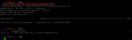 Command used: << wget http://192.168.1.15/~secret/.mysecret.txt >>
