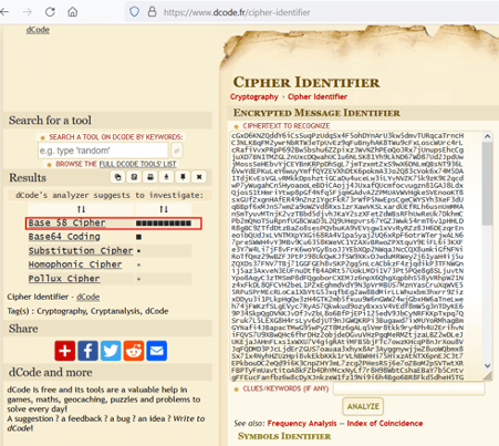 We researched the web to help us identify the encoding and found a website that does the job for us. The website can be seen below. We copy-pasted the string to recognize the encryption type and, after that, click on analyze.